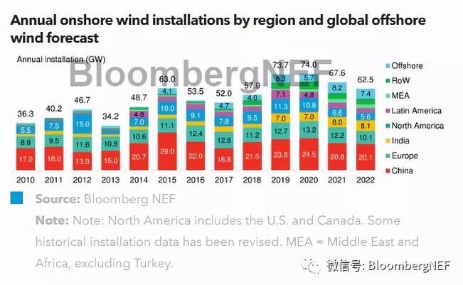 陸上風(fēng)電長期預(yù)測(2023到2030年):我們預(yù)計(jì),全球陸上風(fēng)電裝機(jī)將達(dá)到70GW到103GW之間。我們的預(yù)測是基于《新能源市場長期展望》(NEO),即彭博新能源財(cái)經(jīng)針對電力領(lǐng)域的長期展望報(bào)告做出的。這一分析基于當(dāng)前政策正常實(shí)施,但2020年后沒有新的政策支持,且符合最低電力成本優(yōu)化的原則,即在每個國家以最低成本建設(shè)不同發(fā)電技術(shù),以滿足尖峰及平均用電需求,以及極端天氣的影響。