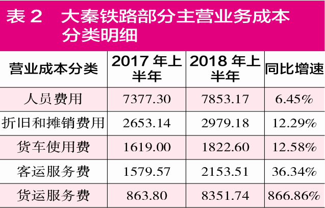 中報數據顯示,2018年上半年大秦鐵路營業成本同比大幅提升50%,營業成本占營業收入的比重由2017年的67.63%增長至74.53%,營業成本的漲幅比營業收入的漲幅高出了近14個百分點(見表1)。而在筆者進一步查閱大秦鐵路財報數據后發現,在“營業收入和營業成本”項目中,“貨運服務費”就是影響大秦鐵路2018年上半年增收不增利的罪魁禍首。這項費用漲幅驚人,同比達到8.7倍(見表2)。