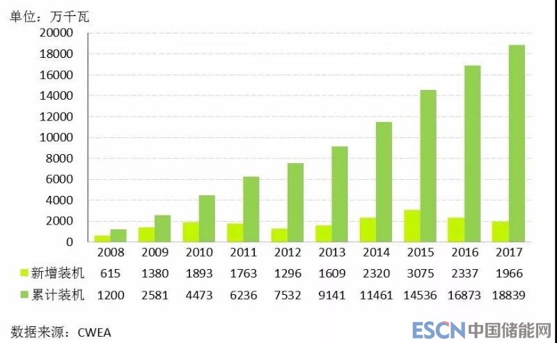 圖1 2008年至2017年中國新增和累計風電裝機容量