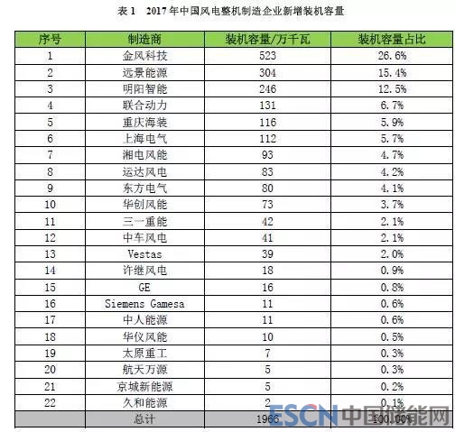 2017年,中國風電統計有新增裝機的整機制造企業共22家,新增裝機容量1966萬千瓦,其中,金風科技新增裝機容量達到523萬千瓦,市場份額達到26.6%;其次為遠景能源、明陽智能、聯合動力和中國海裝,前五家市場份額合計達到67%。