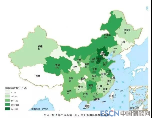 2017年,中國六大區域的風電新增裝機容量所占比例分別為華北(25%)、中南(23%)、華東(23%)、西北(17%)、西南(9%)、東北(3%)。“三北”地區新增裝機容量占比為45%,中東南部地區新增裝機容量占比達到55%。
