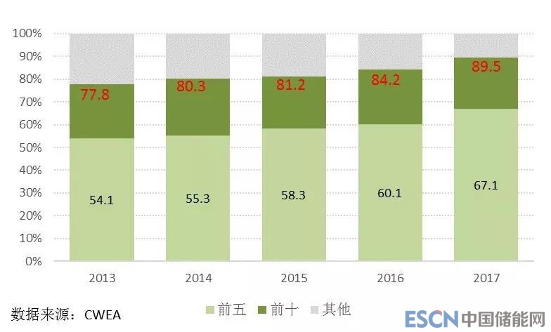 近5年,風電整機制造企業的市場份額集中趨勢明顯。排名前五的風電機組制造企業新增裝機市場份額由2013年的54.1%增長到2017年的67.1%,增長了13%;排名前十的風電制造企業新增裝機市場份額由2013年的77.8%增長到2017年的77.8%增長到2017年的89.5%,增長了12%。