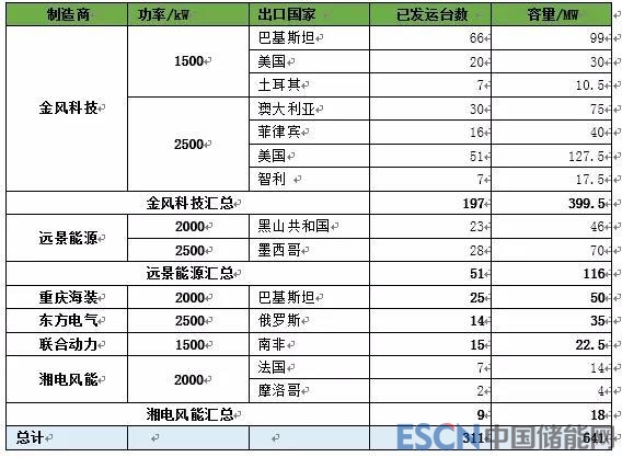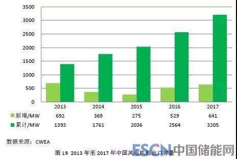 2017年,中國向國外出口風電機組311臺,容量641MW,同比增長21%。截至2017年底,中國風電機組制造企業已出口的風電機組共計1707臺,累計容量達到3205MW。
