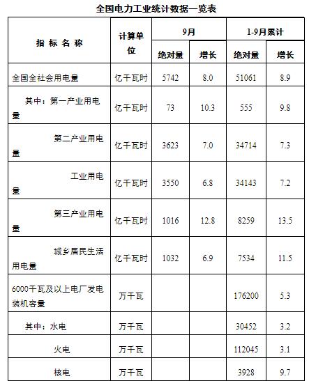 10月26日,國家能源局發(fā)布1-9月份全國電力工業(yè)統(tǒng)計數(shù)據(jù)。1-9月份,全國全社會用電量51061億千瓦時,同比增8.0%;全國售電量41933億千瓦時,同比增10.5%。