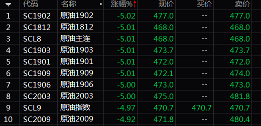 昨日夜盤,中國原油期貨SC1812、1901、1902等合約則全線跌停。今日早盤開盤,原油幾大合約依舊封死跌停板,燃油期貨也大跌超5%,其中1906合約跌停。