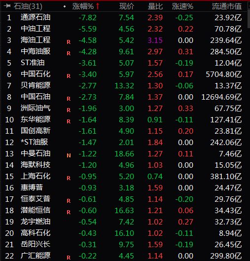 截至收盤,石油板塊位居兩市行業(yè)板塊跌幅首位。個股方面,通源石油(7.540, -0.64, -7.82%)下跌逾7%,中油工程、海油工程、中海油服跌幅超過4%,中國石化跌逾3%,中國石油跌幅近3%。