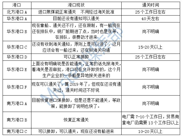 從上表可見,各港口均沒有明確接到進口煤可正常通關通知。部分港口表示可以卸貨,但具體通關還需要和海關溝通、協調。2018年年底進口限制較嚴格,目前正值年初,多港口還沒有船只進港,進口政策還有一定不明確性。后期具體通關情況請持續關注Myteel煤焦事業部。