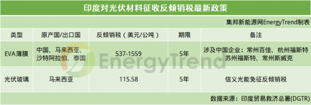 此外,印度貿(mào)易總署(DGTR)還建議對從中國、馬來西亞、沙特以及泰國進口的光伏組件用EVA薄膜征收537-1559美元/公噸(MT)的反傾銷稅,期限為5年。