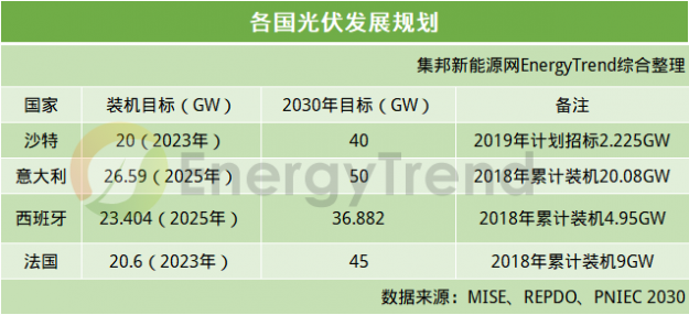 根據(jù)方案,計劃到2020年光伏裝機容量達8.409GW。2030年,西班牙74%的電力將來自可再生能源,占總能源需求的41%。到2050年,光伏裝機容量達50-60GW。此外,西班牙還計劃將儲能項目增加至6GW。
