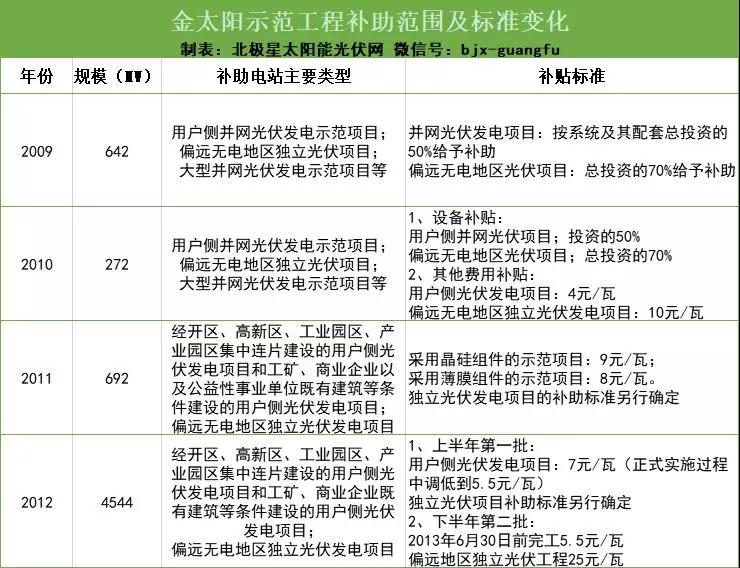 金太陽(yáng)工程:2009年7月,財(cái)政部、科技部、國(guó)家能源局聯(lián)合發(fā)布《關(guān)于實(shí)施金太陽(yáng)示范工程的通知》,計(jì)劃在2~3年內(nèi),采取財(cái)政補(bǔ)助方式支持不低于500MW的光伏發(fā)電示范項(xiàng)目。而具體的補(bǔ)助范圍和金額也在接下來(lái)的2009~2012年進(jìn)行了逐年調(diào)整,見下表:
