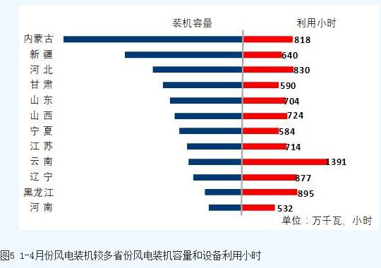 分類型看,1-4月份,全國水電設備平均利用小時為959小時,比上年同期增加114小時。在水電裝機容量超過1000萬千瓦的8個省份中,除湖北同比降低36小時,其他省份均同比增加,湖南和福建同比增加超過400小時,分別增加494和462小時;全國火電設備平均利用小時為1413小時(其中,燃煤發電和燃氣發電設備平均利用小時分別為1461和784小時),比上年同期降低13小時。分省份看,全國共有15個省份火電設備利用小時超過全國平均水平,其中內蒙古、甘肅、河北、安徽和湖北超過1600小時,而云南和西藏僅為472和102小時。與上年同期相比,共有14個省份火電利用小時同比增加,其中四川增加286小時,湖北、貴州、新疆、甘肅和北京增加超過100小時,而廣東和云南下降超過200小時,分別降低247和236小時,青海、湖南、陜西、江西和天津下降也超過100小時。全國核電設備平均利用小時2258小時,比上年同期降低29小時;全國并網風電設備平均利用小時767小時,比上年同期降低46小時;全國太陽能發電設備平均利用小時405小時,比上年同期降低5小時。