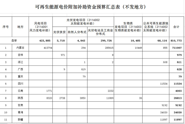 根據《通知》所附的《可再生能源電價附加補助資金預算匯總表》,風電、光伏項目補貼約為42億元以及30.8億元。其中,光伏扶貧、自然人分布式和光伏電站及工商業分布式分別為0.37億元、0.48億元和29.97億元。其中,內蒙古各類可再生能源補貼合計71億元,占比近九成,位居第一。
