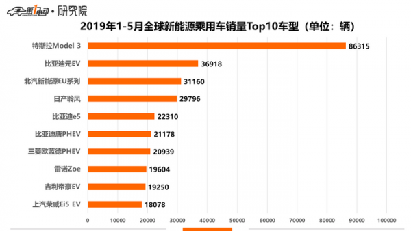 特斯拉Model 3依然傲冠群雄,5月當月和2019年1-5月累計銷量排名均遙遙領先。
