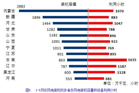 分類型看,1-5月份,全國水電設(shè)備平均利用小時(shí)為1300小時(shí),比上年同期增加145小時(shí)。在水電裝機(jī)容量超過1000萬千瓦的8個(gè)省份中,水電設(shè)備平均利用小時(shí)均同比增加,福建和湖南同比增加超過600小時(shí),分別增加636和661小時(shí),廣東和云南同比增加超過300小時(shí),分別增加306和304小時(shí);全國火電設(shè)備平均利用小時(shí)為1728小時(shí)(其中,燃煤發(fā)電和燃?xì)獍l(fā)電設(shè)備平均利用小時(shí)分別為1783和971小時(shí)),比上年同期降低48小時(shí)。分省份看,全國共有14個(gè)省份火電設(shè)備利用小時(shí)超過全國平均水平,其中內(nèi)蒙古和河北超過2000小時(shí),海南、湖北、安徽、江西、陜西和甘肅也超過1900小時(shí),而云南和西藏僅為654和124小時(shí)。與上年同期相比,共有12個(gè)省份火電利用小時(shí)同比增加,其中四川增加318小時(shí),湖北、廣西、貴州、新疆、重慶和北京增加超過100小時(shí),而廣東和云南下降超過300小時(shí),分別降低402和309小時(shí),青海、湖南、江西、上海、福建、陜西、天津、浙江、河南和遼寧下降也超過100小時(shí)。全國核電設(shè)備平均利用小時(shí)2839小時(shí),比上年同期降低75小時(shí);全國并網(wǎng)風(fēng)電設(shè)備平均利用小時(shí)978小時(shí),比上年同期降低24小時(shí);全國太陽能發(fā)電設(shè)備平均利用小時(shí)532小時(shí),與上年同期基本持平。