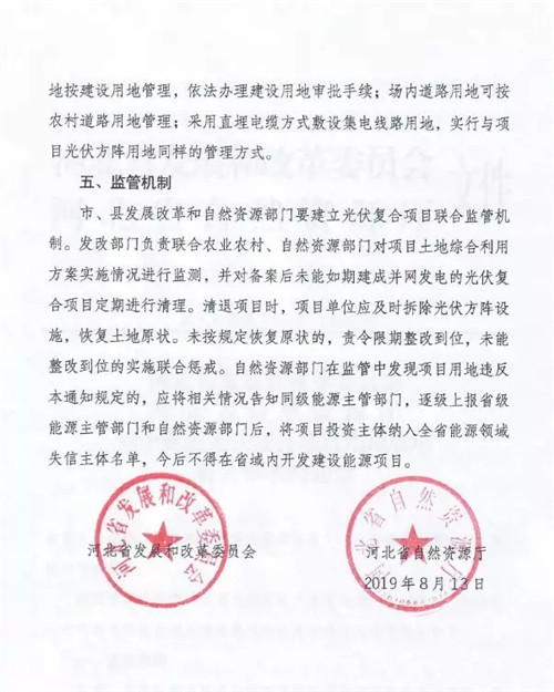 近日,河北省發改委、自然資源廳聯合發布了《關于規范光伏復合項目用地管理有關事項的通知》,通知明確可以使用除永久農田之外的農用地進行光伏復合項目的開發建設,包括農光互補、漁光互補等項目。但該文件也明確提出了光伏復合項目的用地標準:組件最低沿應高于地面2.5米,樁基列間距應大于4米、行間距應大于6.5米。在水面建設的光伏復合項目,在滿足光伏發電規程規范要求的前提下,各地自行制定建設標準。