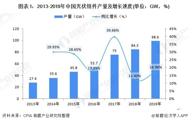 我國是光伏產業大國,擁有全球最完整的產業鏈。2019年,同期,盡管在政策調整下,我國光伏應用市場有所下滑,但受益于海外市場的增長,中國光伏各環節產業規模依舊保持了快速增長勢頭。2019年,中國光伏組件產量達到了98.6GW,占全球產量比重不斷上升。作為全球最大光伏產品制造國及出口國,中國光伏裝機量、發電量已連續多年位列全球首位。