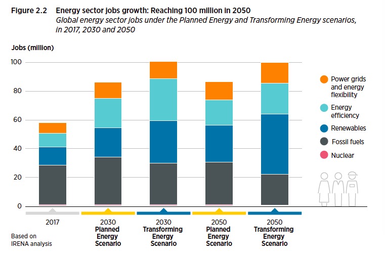 報告顯示,為了實現能源系統的深度去碳化,雖然需要新投約130萬億美元,但這類投資的社會經濟收益將是巨大的。從現在到2050年,與常規情境相比,能源系統的轉型能使全球GDP多增加98萬億美元,并且將使可再生能源產業的就業增加近三倍,達到4200萬個,并推動能源效率相關的就業機會增加到2100萬,電網靈活性相關的就業增加到1500萬個。