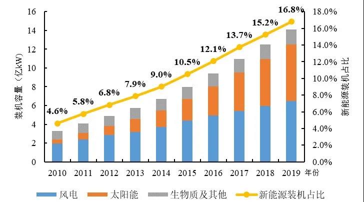 圖1 2010-2019年全球新能源發電裝機容量及占比