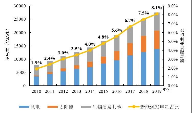 圖2 2010-2019年全球新能源發電量及占比
