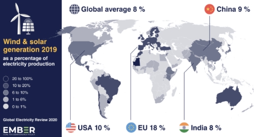 根據Ember-Climate網站的匯總,2019年風能和太陽能發(fā)電量占全球發(fā)電量的8%,而這一比例在歐盟高達18%。