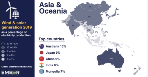 在亞洲和大洋洲,風能和太陽能發(fā)電大體相當,分別占發(fā)電量的4%和3%,繼續(xù)發(fā)展風能和太陽能是結束亞洲和大洋洲地區(qū)對煤炭依賴的關鍵。2019年7%的電力來自風能和太陽能,主要的風能和太陽能發(fā)電國家是澳大利亞(15%)、日本(9%)、中國(9%)、印度(8%)、蒙古(7%);比較滯后的國家包括印度尼西亞(0.1%)、馬來西亞(0.7%)和孟加拉國(0.8%)。其中澳大利亞的風能和太陽能份額在短短3年內翻了一番,而越南在2019年表現更出色,尤其是太陽能,占總比例從0%增加到3%。