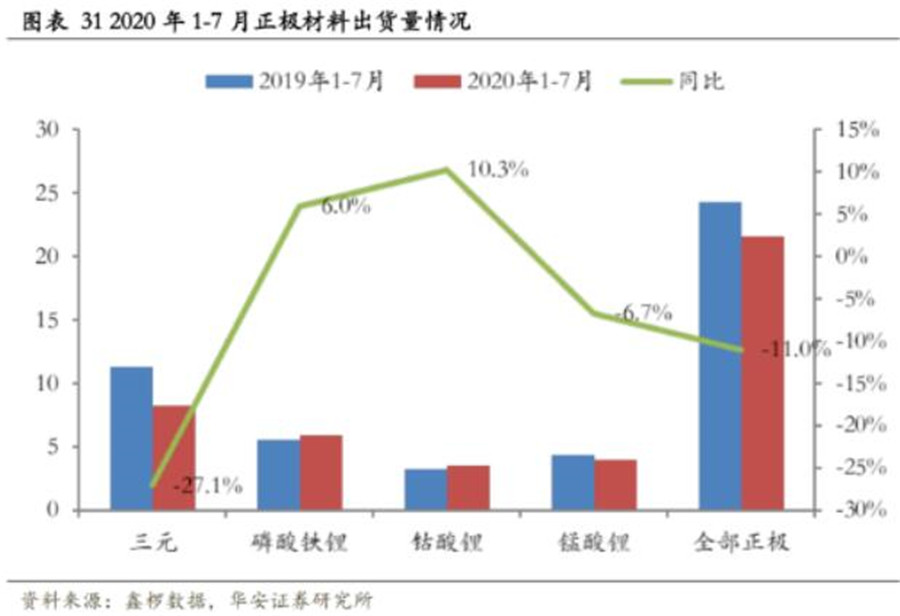 而磷酸鐵鋰曾經(jīng)是電動(dòng)車動(dòng)力電池領(lǐng)域的王者,2016年市占率高達(dá)6成,隨后,逐漸被三元反超,2019年跌到3成左右。但今年上半年市場(chǎng)起了變化,三元電池出貨量大幅減少,而磷酸鐵鋰電池出貨量開始增加。