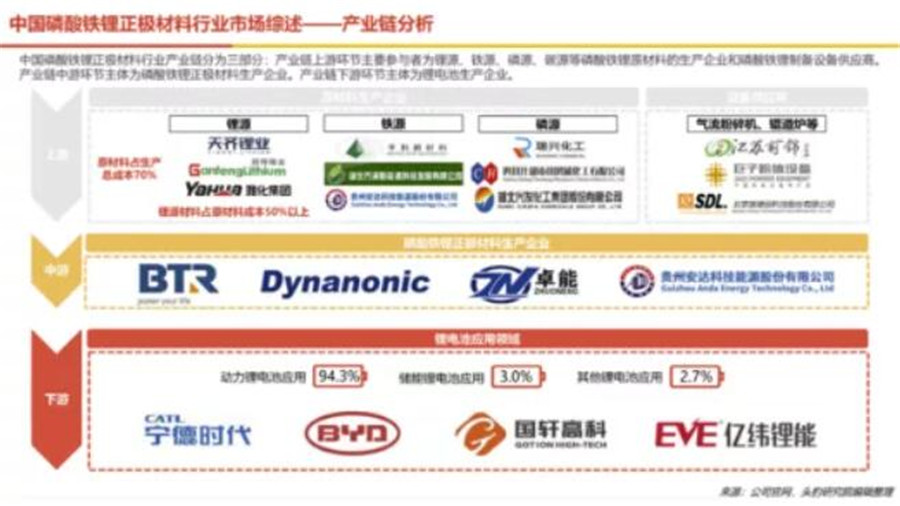 中游生產(chǎn)商主要有貝特瑞、德方納米、深圳卓能、貴州安達(dá)。下游使用商主要有寧德時(shí)代、比亞迪、國(guó)軒高科、億緯鋰能。
