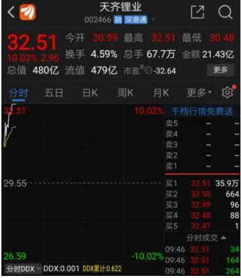 9日開盤,天齊鋰業(yè)大漲4.87%,報(bào)30.99元,11分鐘后封死漲停,報(bào)32.51元,封單近36萬手。