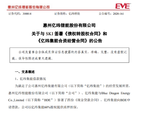 12月9日,億緯鋰能公告透露,擬通過債轉(zhuǎn)股的方式引入SKI作為戰(zhàn)略投資者。