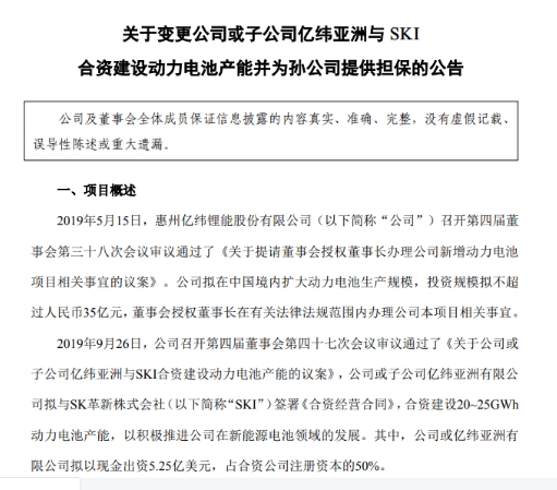 2019年9月26日,億緯鋰能董事會通過議案,公司或子公司億緯亞洲有限公司擬與SKI簽署《合資經(jīng)營合同》,合資建設20~25GWh動力電池產(chǎn)能,以積極推進公司在新能源電池領(lǐng)域的發(fā)展。其中,公司或億緯亞洲有限公司擬以現(xiàn)金出資5.25億美元,占合資公司注冊資本的50%。