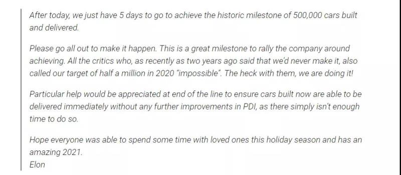 在距今年結(jié)束僅剩5天的時(shí)間,馬斯克再次致信員工,認(rèn)為仍有可能實(shí)現(xiàn)目標(biāo),鼓勵(lì)員工團(tuán)結(jié)起來,證明懷疑者是錯(cuò)的。馬斯克在信中表示:“請(qǐng)全力以赴地去實(shí)現(xiàn)目標(biāo)。這是一個(gè)公司可以團(tuán)結(jié)起來實(shí)現(xiàn)的偉大里程碑。兩年前還有人說我們永遠(yuǎn)實(shí)現(xiàn)不了,稱50萬的目標(biāo)不可能,不要管他們,我們就要實(shí)現(xiàn)了!”