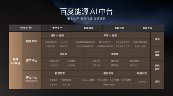 在2020百度世界大會智能云分論壇上,百度智能云能源AI中臺首次正式對外發(fā)布。能源AI中臺為能源企業(yè)智能化升級提供從方法論、平臺、服務在內的全套工具,幫助能源生產更安全,傳輸更高效,客戶服務更優(yōu)質。基于能源AI中臺解決方案,能源企業(yè)可以更快速地實現上層的智能應用,快速搭建“數據+平臺+應用”的新模式,并且具備持續(xù)創(chuàng)新、不斷演進的自生能力。