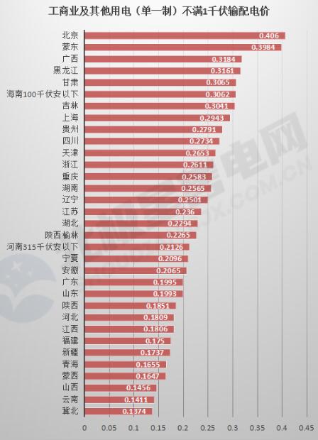 工商業(yè)及其他用電(單一制)1千伏輸配電價(jià)從高到低看,排在前五位的省份分別是:北京、蒙東、廣西、黑龍江、甘肅,北京最高為0.406元/千瓦時(shí)。排在后五位的分別是冀北、云南、山西、蒙西、青海,其中冀北最低為0.1374元/千瓦時(shí)。總體來看,全國工商業(yè)及其他用電(單一制)1千伏輸配電價(jià)平均水平為0.2393元/千瓦時(shí),15個(gè)地區(qū)高于此水平(河北分為冀北和河北南部電網(wǎng)),18個(gè)地區(qū)低于此水平。如下所示: