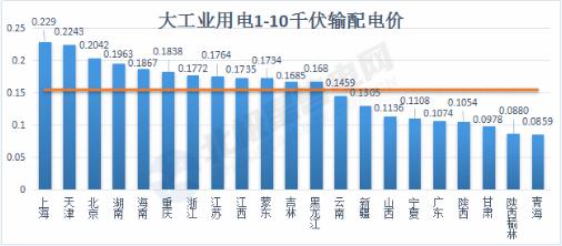 大工業(yè)用電1-10千伏輸配電價(jià)最高的為上海0.229元/千瓦時(shí),最低的為青海0.0859元/千瓦時(shí),平均水平為0.1546元/千瓦時(shí)。