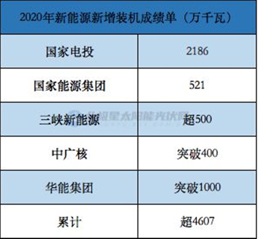 近日,國家電投、國家能源集團、三峽新能源、中廣核、華能集團相繼公布2020年新能源新增裝機量,累計超過46.07GW,給2020年交上了亮眼成績單。