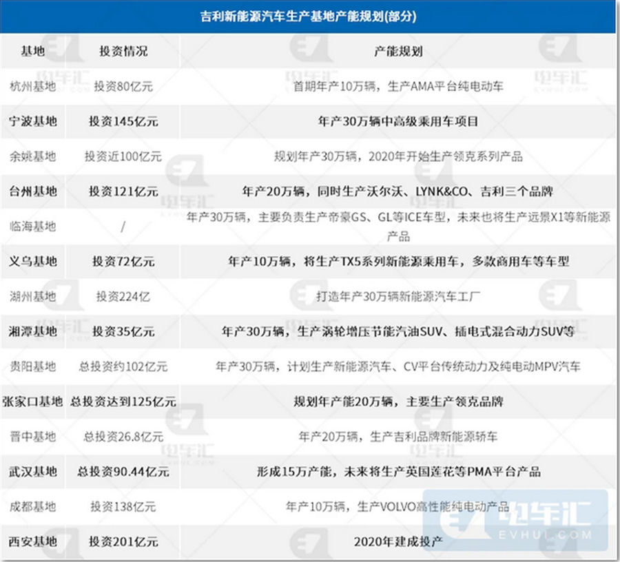 事實上,這幾年,吉利全國各地投資建廠,砸錢打造汽車基地,吉利僅在杭州、寧波、貴州、義烏等地宣布投資數百億,其中多個為新能源汽車生產基地。根據電車匯相關的統計相關的產能或達300萬輛。