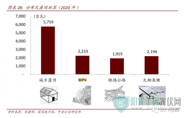 根據這份報告分析,我國的分布式光伏在中東部地區的開發主要基于戶用和工商業屋頂項目,以及道路、農業大棚、魚塘等閑置分散土地資源。參考城鄉建設用地與屋頂可開發資源比例的遙感及實際摸排數據進行測算,按 200W/平米評估,我國城鄉屋頂分布式光伏可開發空間在約 5800 GW水平,幕墻的 BIPV 部分可貢獻約2200GW水平。