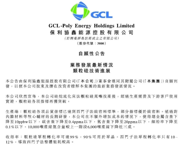 協鑫公告稱,顆粒硅技術,寶劍鋒從磨礪出:FBR顆粒硅技術對比目前市場主流改良西門子法,具備低耗能、連續生產的優勢,有望成為下一代光伏硅料技術。公司自2010年開始,歷時多年自主研發顆粒硅技術,并通過收購海外資產助力,最終實現了電子級顆粒硅量產。公司顆粒硅產品為市場主流棒狀硅的有效補充,已在下游客戶實現了質量驗證,目前徐州顆粒硅1萬噸項目已正式投產,未來發展值得期待。