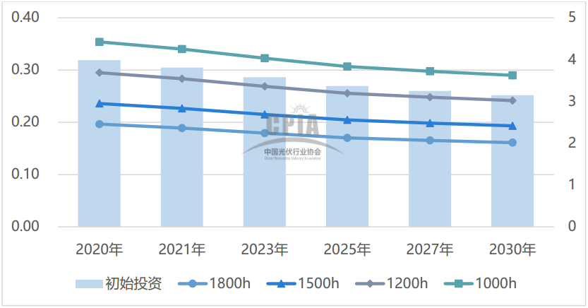 根據(jù)中國(guó)光伏協(xié)會(huì)(CPIA)發(fā)布的《中國(guó)光伏產(chǎn)業(yè)發(fā)展線路圖(2020版)》,2020年,全投資模型下的地面光伏電站在1800h、1500h、1200h、1000h的LCOE(平準(zhǔn)發(fā)電成本)分別為0.2、0.24、0.29、0.35元/kWh(分布式光伏電站為0.17、0.2、0.26、0.31元/kWh)。2021年后在大部分地區(qū)實(shí)現(xiàn)與煤電基準(zhǔn)同價(jià)。