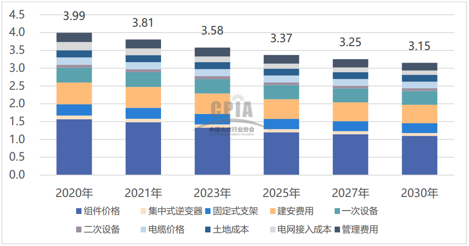 據(jù)CPIA預(yù)計(jì),2021年,隨著產(chǎn)業(yè)鏈各環(huán)節(jié)新建產(chǎn)能的逐步釋放,組件價(jià)格回歸合理水平,光伏系統(tǒng)初始全投資成本可下降至3.81元/W,到2030年,我國(guó)光伏系統(tǒng)初始投資成本將會(huì)降至3.15元/W。