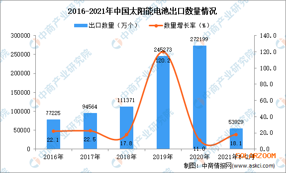 據中商產業研究院數據庫顯示,2021年2月中國太陽能電池出口量為53929萬個,同比增長18.1%。