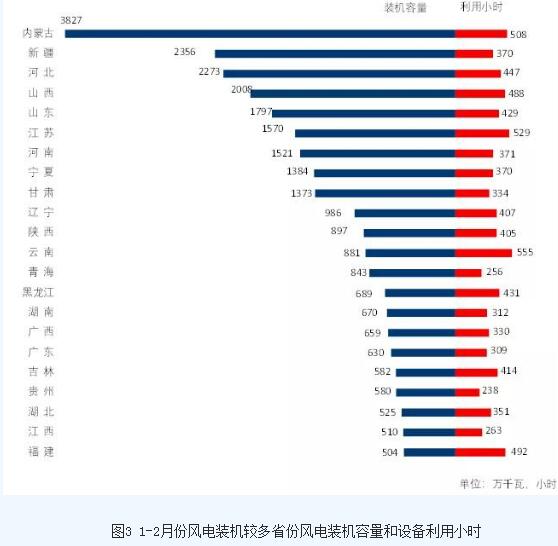 分類型看,1-2月份,全國水電設備平均利用小時為401小時,比上年同期提高21小時。在水電裝機容量排前10的省份中,貴州、云南、四川、廣西和湖北分別增加71、70、55、31和8小時,湖南、福建、青海、廣東和浙江同比分別降低200、75、26、19和18小時;全國火電設備平均利用小時為732小時(其中,燃煤發電和燃氣發電設備平均利用小時分別為762和379小時),比上年同期提高96小時。分省份看,全國共有18個省份火電設備利用小時超過全國平均水平,其中甘肅和青海超過900小時,新疆、四川、北京、江西、重慶、寧夏、湖北、內蒙古、陜西和廣西超過800小時,而西藏僅為66小時。與上年同期相比,全國除海南、黑龍江、遼寧和內蒙古外,其他省份火電利用小時均同比提高,其中重慶、貴州、浙江和云南提高超過200小時,分別為274、254、234和234小時;核電設備平均利用小時1147小時,比上年同期提高176小時;全國并網風電設備平均利用小時419小時,比上年同期提高106小時;全國太陽能發電設備平均利用小時192小時,比上年同期提高25小時。