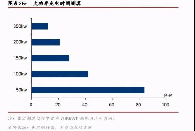 這兩種規格的充電樁基本上算是市面上比較大功率的充電樁了。按照華泰證券做的充電時間測算,80kw、160kw的充電樁至少也得半個小時才能充滿。