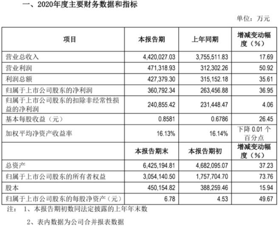 其中,經(jīng)初步核算,2020年度通威股份實現(xiàn)營業(yè)收入442.00億元,同比增長 17.69%;實現(xiàn)歸屬于上市公司股東的凈利潤36.08億元,同比增長36.95%;扣除非經(jīng)常性損益后歸屬于上市公司股東的凈利潤為24.09億元,同比增長4.06%;基本每股收益0.8581元,同比增長26.45%。