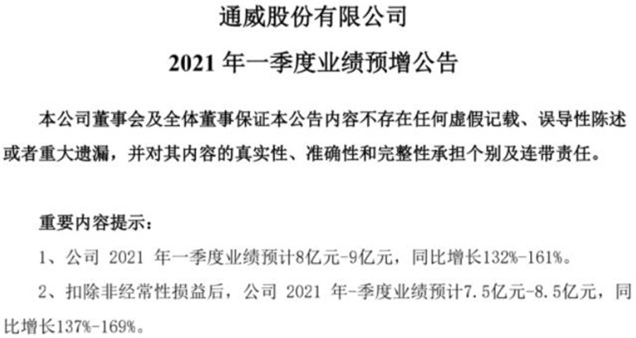 日前,通威股份有限公司(下稱“通威股份”)發(fā)布2020年度業(yè)績快報公告及20201年一季度業(yè)績預(yù)增公告。
