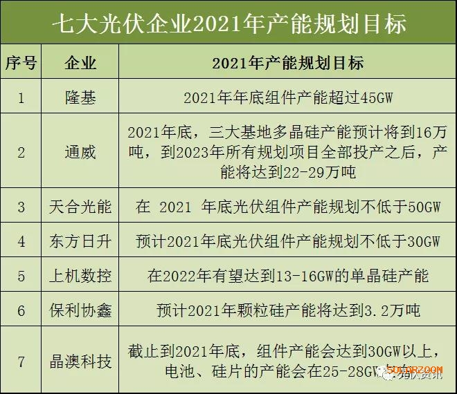 七家光伏企業2021年產能規劃目標如下: