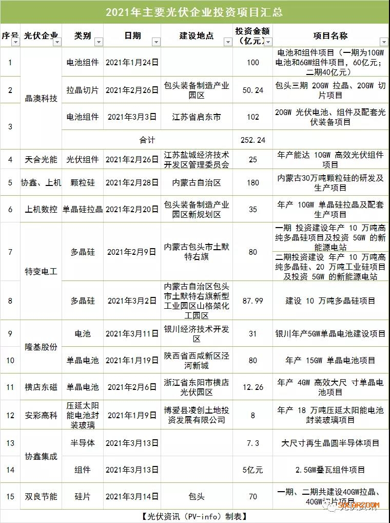 光伏資訊整理2021年開年至今主要光伏企業投資項目,匯總如下: