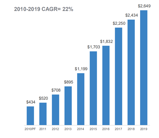 據(jù)公開財(cái)報(bào)顯示,F(xiàn)leetCor在上市后的10年中,每年復(fù)合增增長率均保持在22%以上,其2019年?duì)I收總額已達(dá)到26.49億美元。覆蓋13.25萬座加油站、2.3萬家個(gè)體商戶和2.6萬家維修站點(diǎn)的龐大加油服務(wù)網(wǎng)絡(luò)。