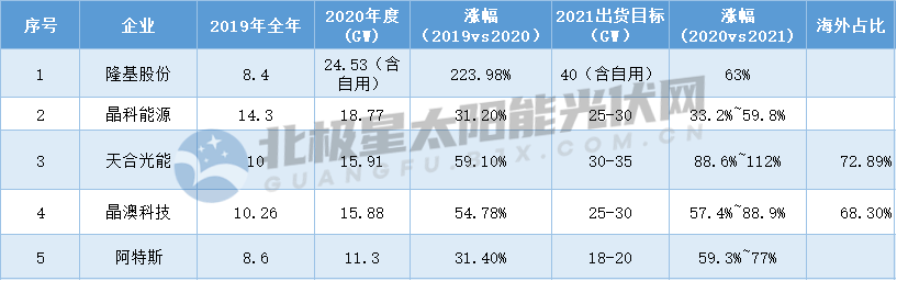 隨著組件企業(yè)2020年報陸續(xù)出爐,2020年其組件出貨規(guī)模也終于明朗,據(jù)統(tǒng)計隆基、晶科、天合、晶澳、阿特斯2020年組件總出貨為86.39GW,較去年大漲67.7%。其中隆基股份首次超越晶科以24.53GW(含自用)拔得頭籌,其出貨量較去年大漲223.98%,在全球的市場占有率約為19%。此外,天合、晶澳組件出貨漲幅在50%以上,晶科、阿特斯?jié)q幅在30%左右。