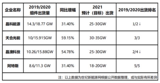 2021年,各家企業在2020年出貨量的基礎上相繼調高出貨目標。相關材料顯示:晶科在2021年預計(目標)出貨量為25-30GW,相較2020年增長33.2%-59.8%;天合預計(目標)出貨量30-35GW,相較2020年增長88.5%-119.95;晶澳預計(目標)出貨量25-30GW,相較2020年增長57.4%-88.9%;阿特斯預計(目標)出貨量18-20GW,相較2020年增長59.3%-77%。